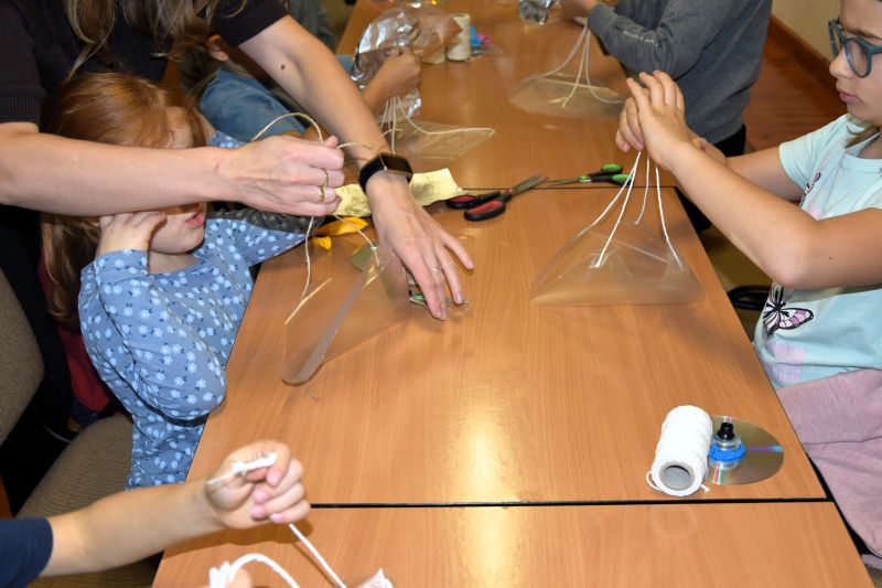Na zajęciach powstały również spadochrony. Dzieci wielokrotnie sprawdzały w jaki sposób działają, mocując do nich przedmioty o różnym ciężarze.