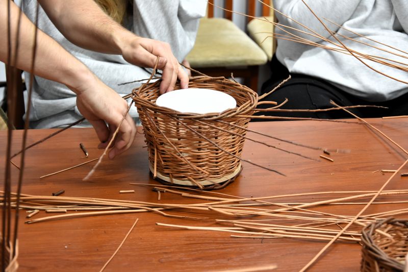 Zajęcia rozpoczęły się od krótkiego wprowadzenia – nie tylko o historii plecionkarstwa, ale także o tym, skąd pochodzi wiklina, jak się ją przygotowuje i dlaczego jest tak wdzięcznym materiałem. Szybko okazało się, że nie trzeba mieć doświadczenia ani wyjątkowych zdolności manualnych, by stworzyć coś pięknego i użytecznego – wystarczy cierpliwość, skupienie i… trochę siły w palcach!