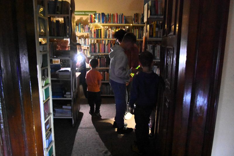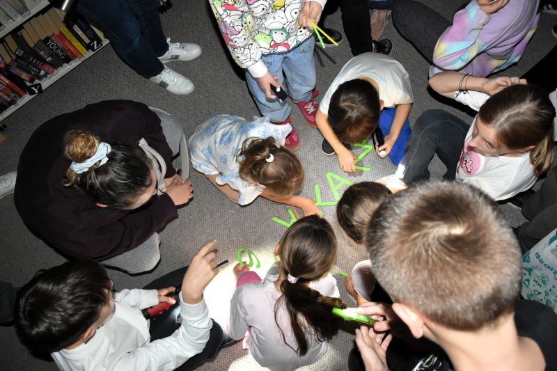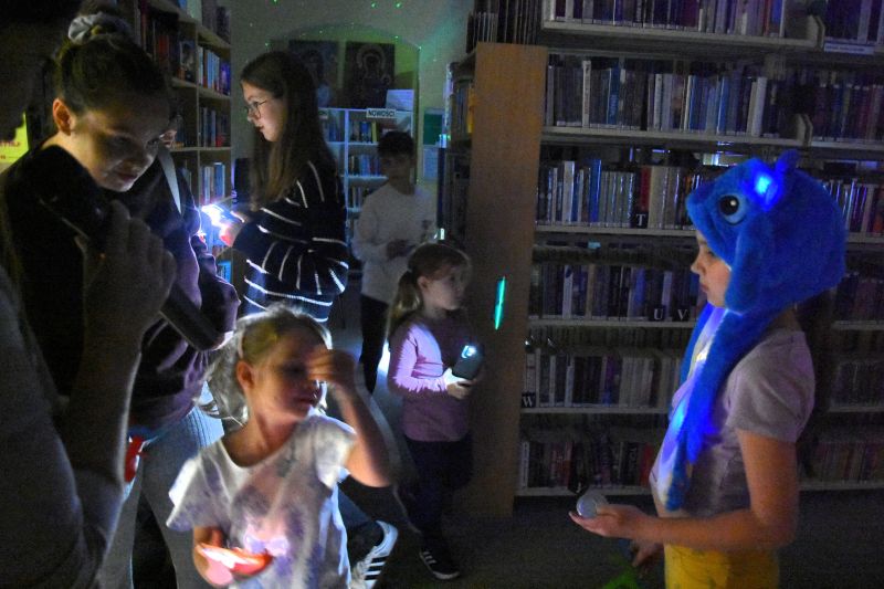 Najwięcej radości sprawiło dzieciom poszukiwanie w ciemnych zakamarkach biblioteki ukrytych literek, z których ułożyliśmy hasło: Książki mają moc. Do tego zadania przydały nam się latarki. Rodzice też mieli w tym dużo frajdy. Na zakończenie wieczoru wykonaliśmy bransoletki świecące w ciemności.