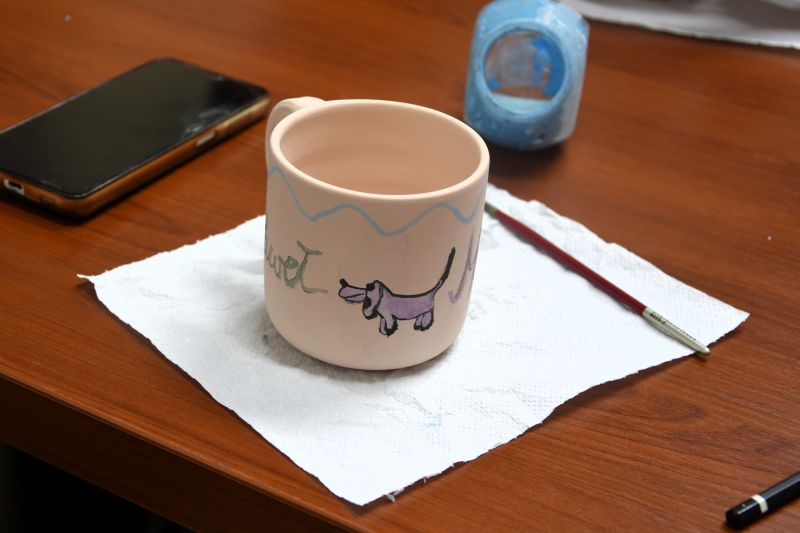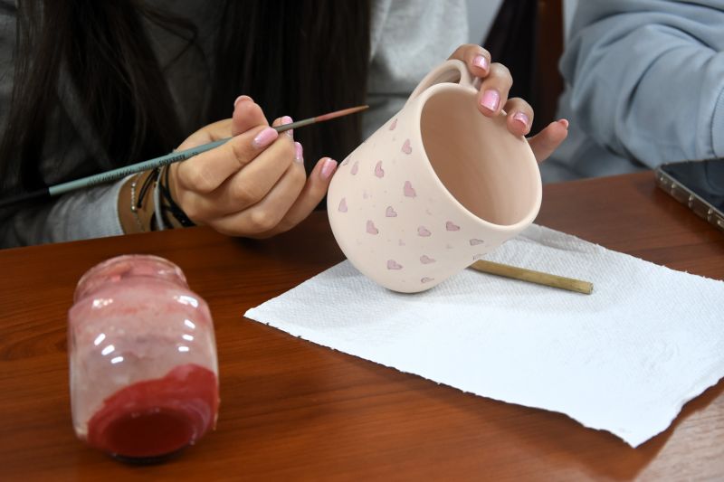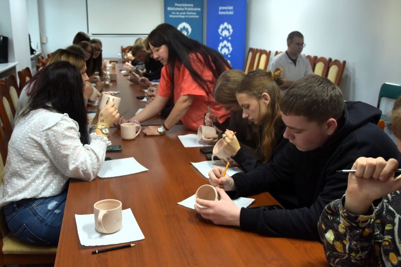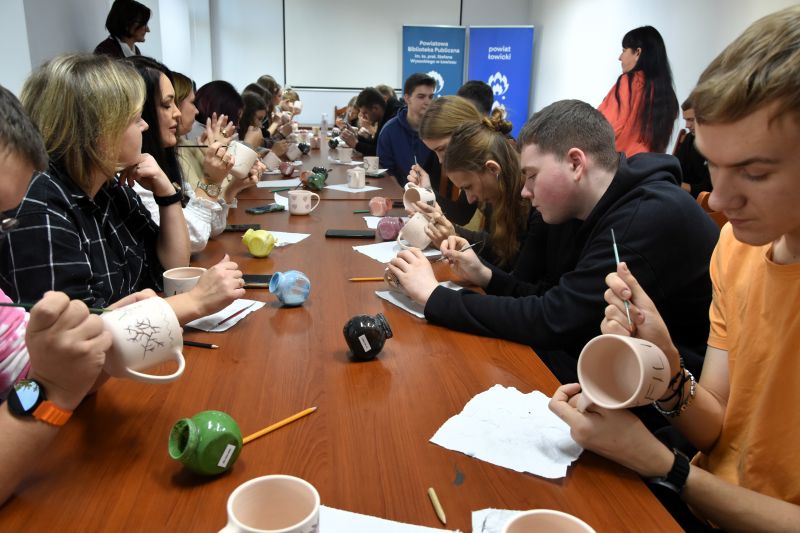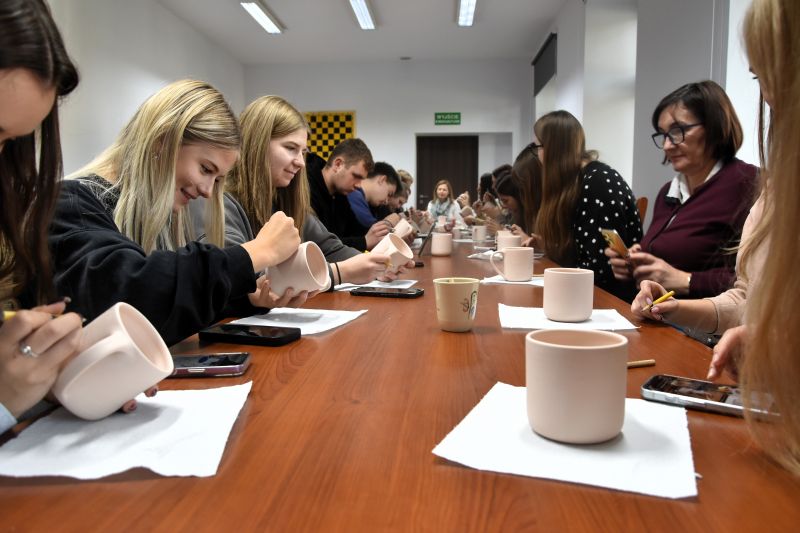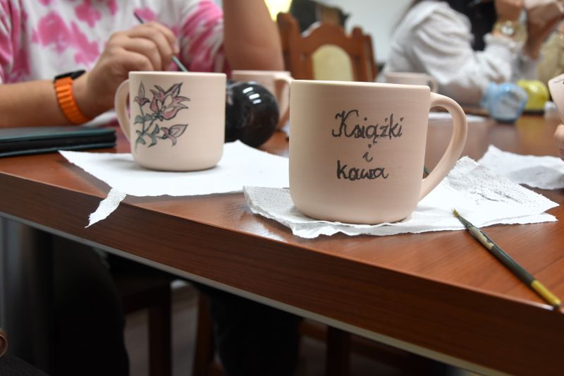 Młodzież zapoznała się również z materiałami niezbędnymi do toczenia naczyń oraz z różnymi metodami ich wypalania. Warsztaty zakończyły się kreatywną częścią – malowaniem kubków specjalnymi farbami do ceramiki.