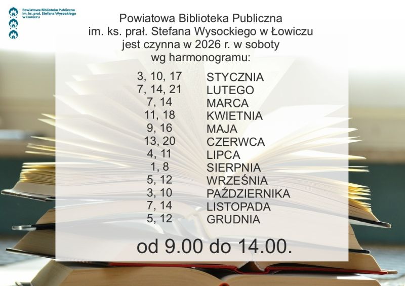 Powiatowa Biblioteka Publiczna im. ks. prał. Stefana Wysockiego w Łowiczu jest czynna w 2026 r. w soboty wg harmonogramu: